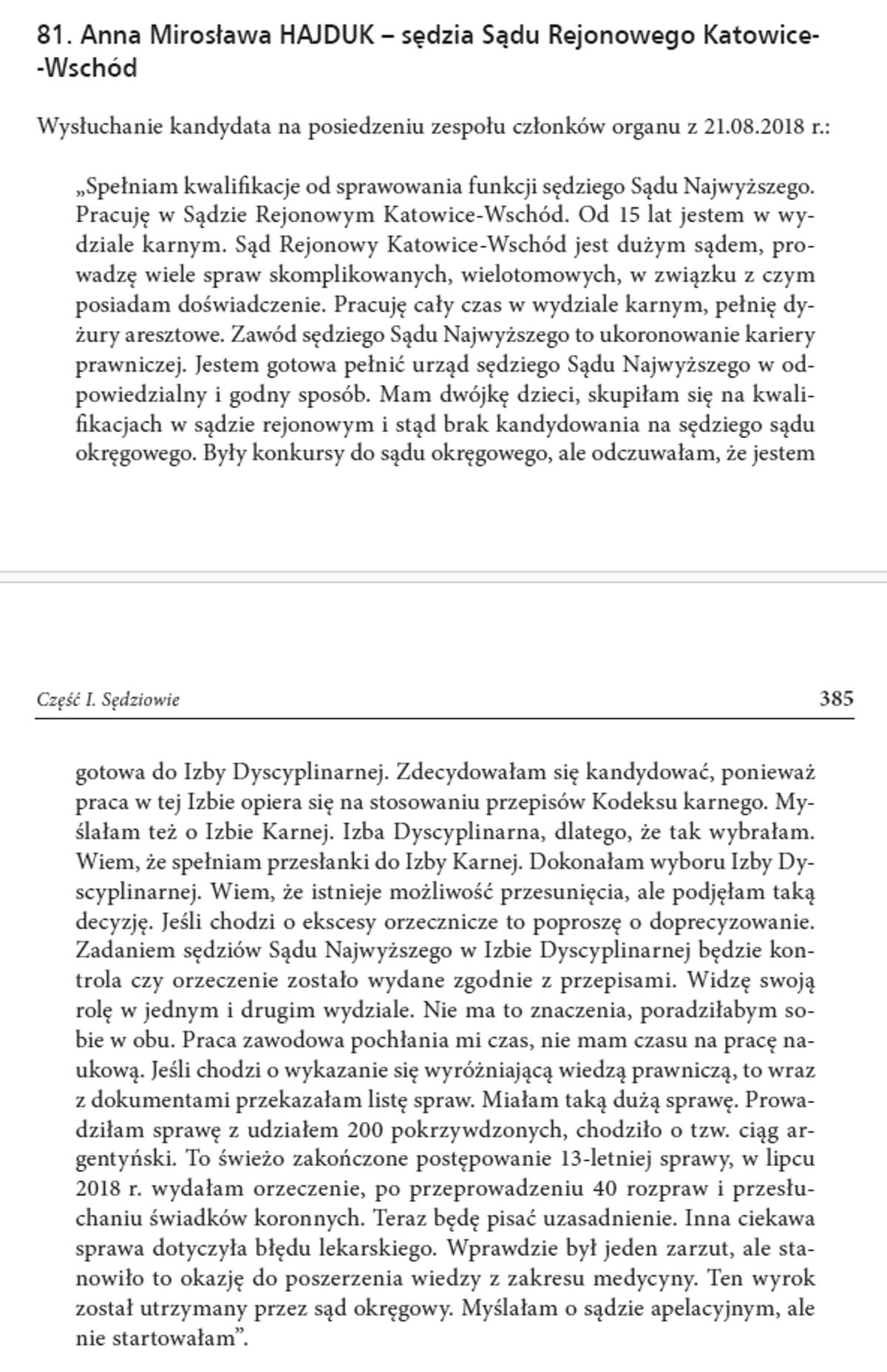 Kandydowała do Izby Dyscyplinarnej przy Sądzie Najwyższym (por: Wymiar sprawiedliwości pod presją. Represje jako metoda walki o przejęcie kontroli nad władzą sądowniczą i prokuraturą w Polsce w latach 2015-2023.) protokół wysłuchania kandydatki: