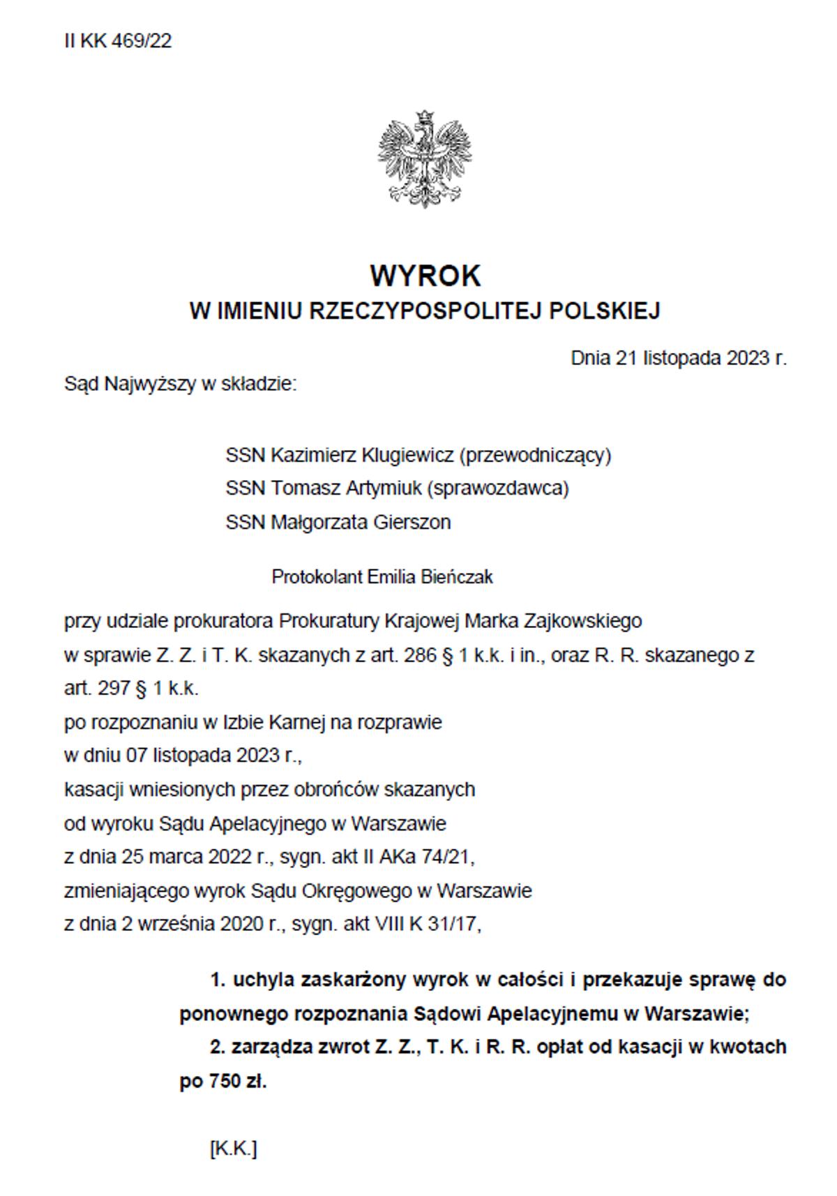 Uwzględnienie powyższego implikowało uchylenie zaskarżonego wyroku sądu ad quem w całości i przekazanie sprawy temu Sądowi do ponownego rozpoznania."