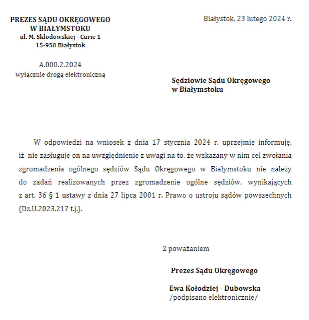 U C H W A Ł A nr 1 Zgromadzenia Ogólnego Sędziów Sądu Okręgowego w Białymstoku z 19 kwietnia 2024 r.: