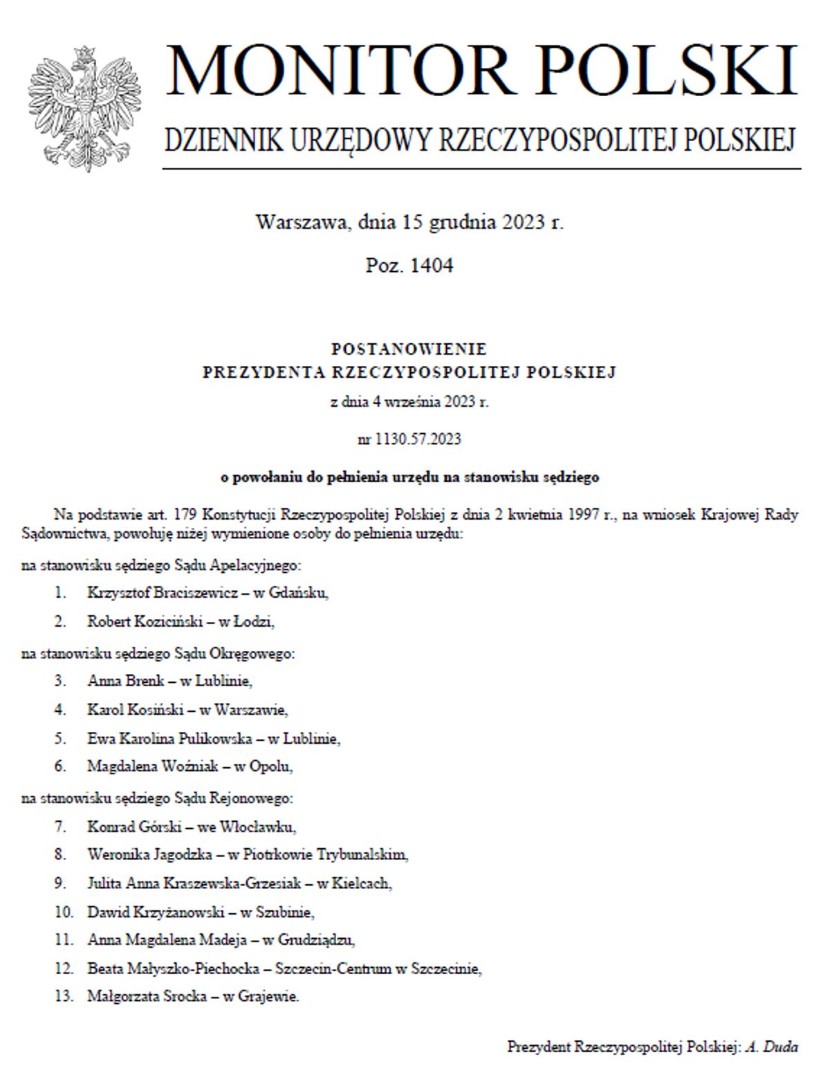 - postanowieniem Prezydenta RP z dnia 4 września 2023 r. powołany do pełnienia urzędu na stanowisku sędziego Sądu Apelacyjnego w Gdańsku (M.Pol. z dnia 15 grudnia 2023 r., poz. 1404 );