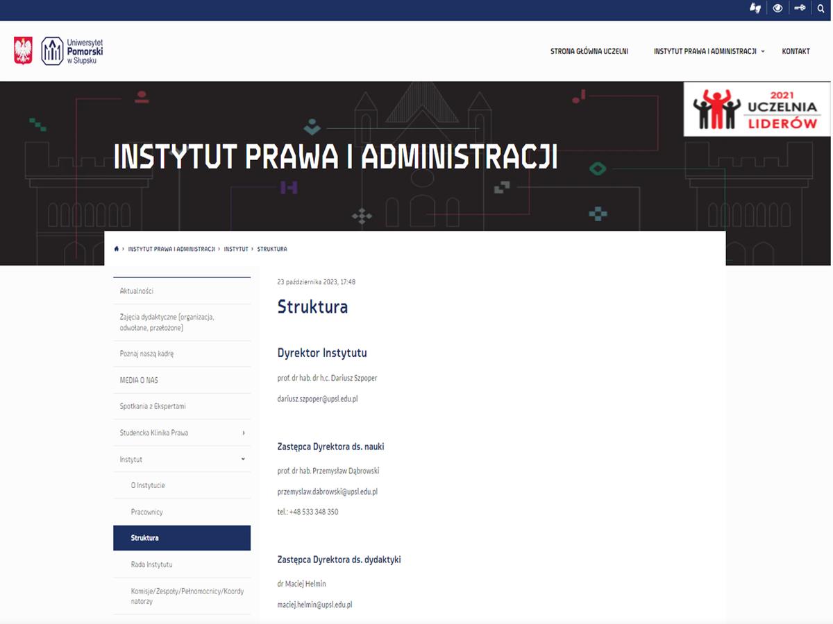 - pełni obowiązki (01.07.2024r.) Zastępcy Dyrektora ds. nauki Instytutu Prawa i Administracji Uniwersytetu Pomorskiego w Słupsku