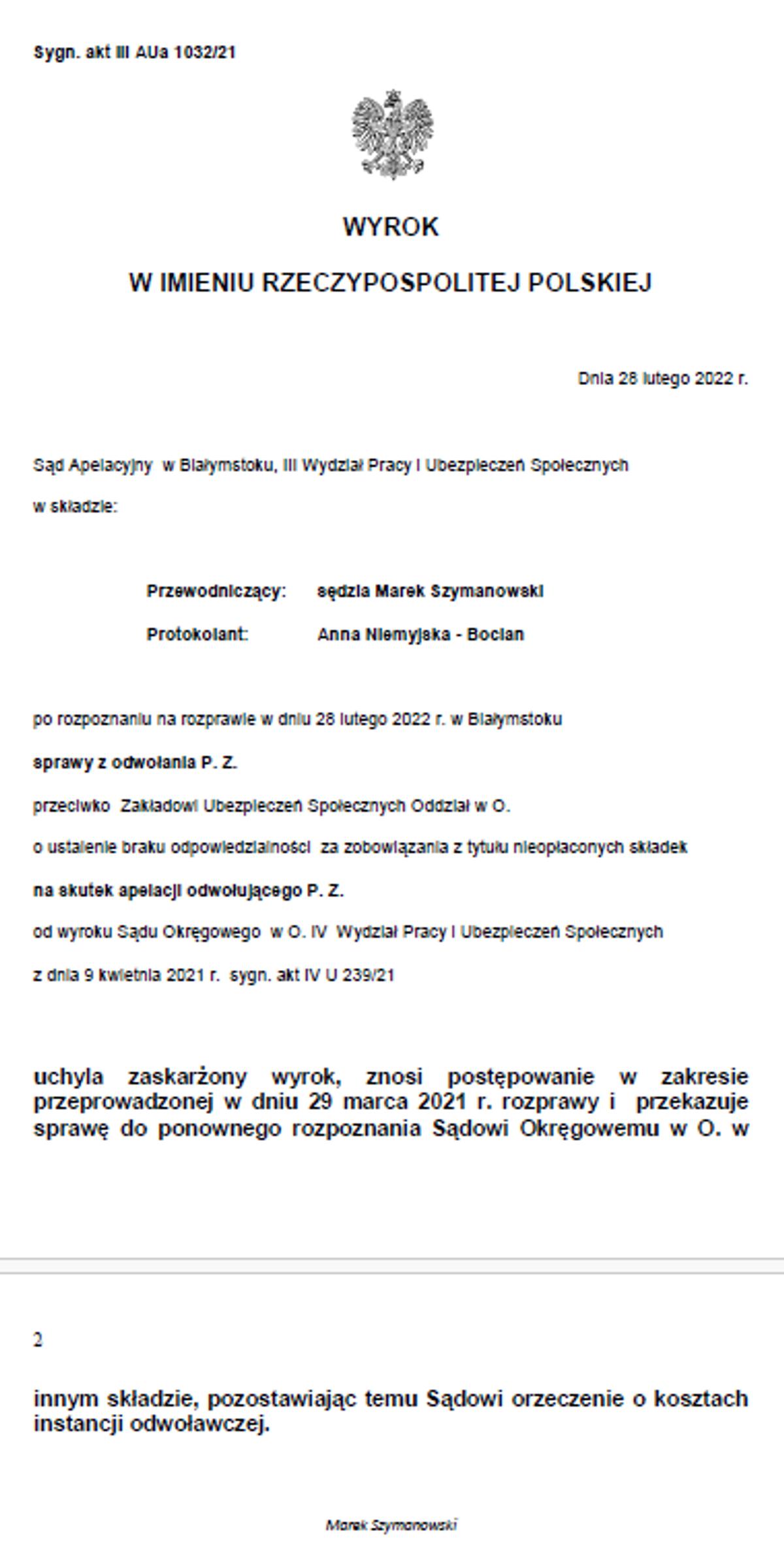 po przeprowadzeniu tzw. “testu Ástráðsson” Sąd Apelacyjny w Białymstoku uchylił wyrok Sądu Okręgowego w składzie z sędzią Tomaszem Kosakowskim