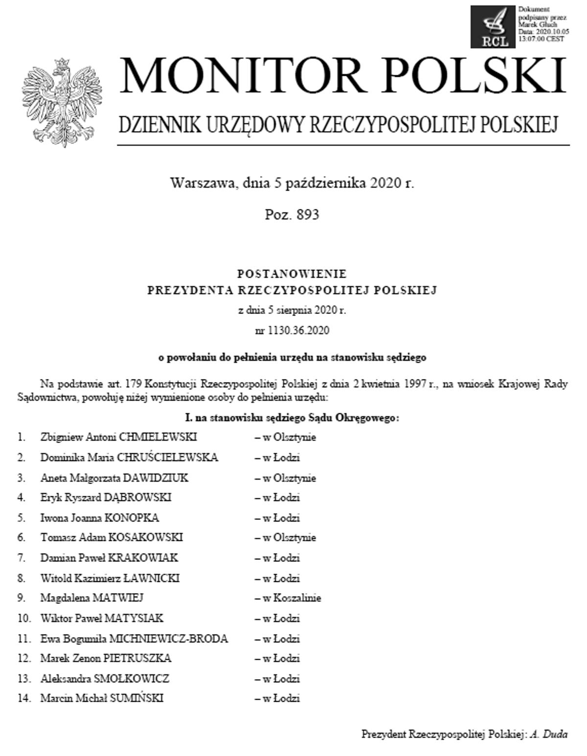 Ogłoszenie nominacji Monitor Polski 2020 poz. 893