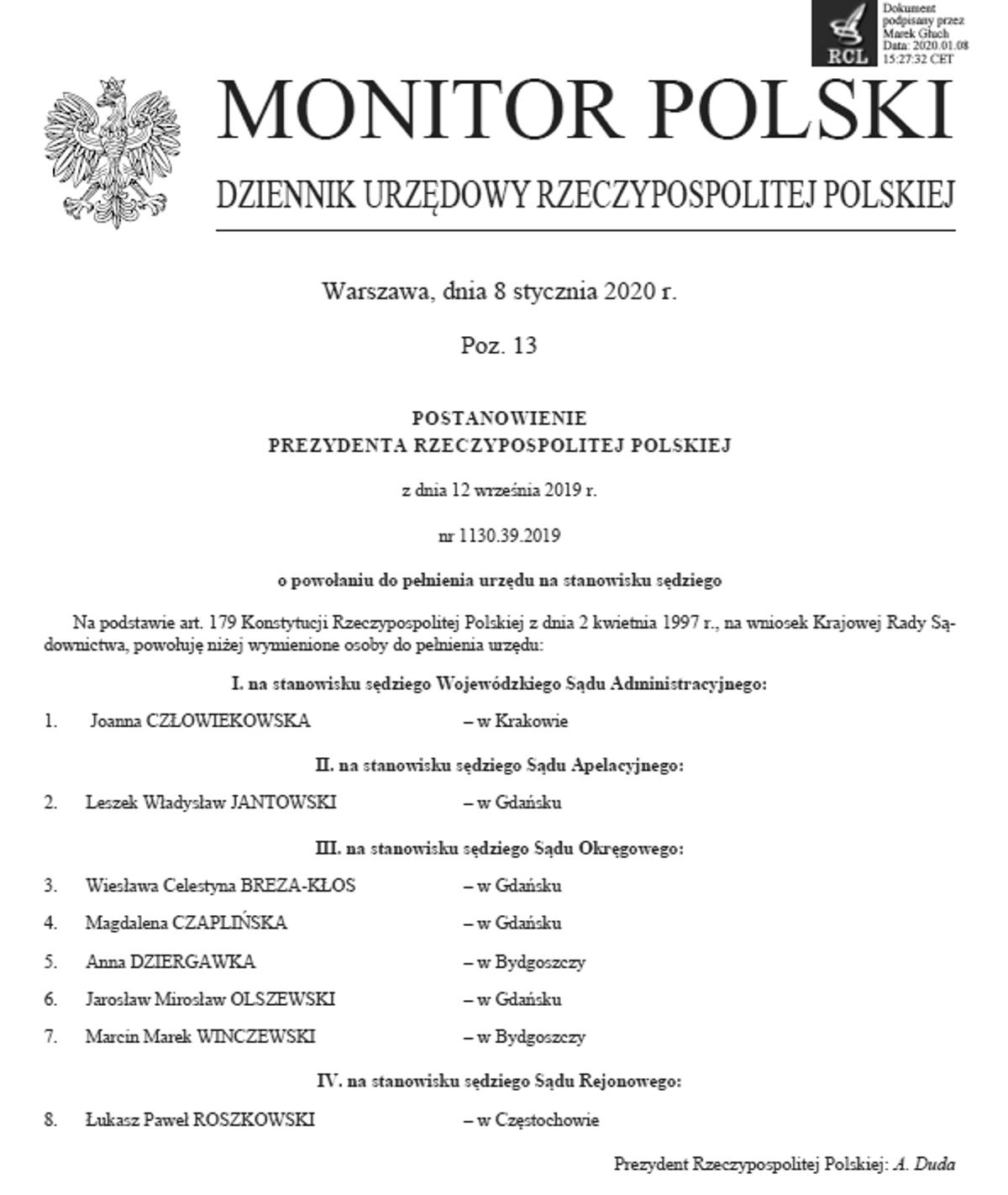 OGŁOSZENIE NOMINACJI Monitor Polski 2020 poz. 13